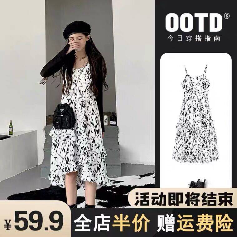2021年新款女装小个子法式气质小众设计感碎花吊带连衣裙子春夏装