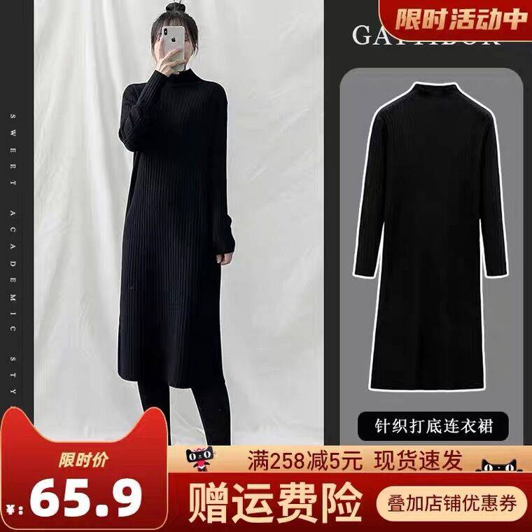 2021年秋冬新款大码女装大衣内搭长款毛衣裙针织打底高领连衣裙子