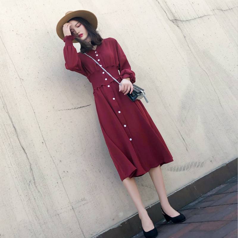 气质V领长裙2018秋装女装新款春秋长袖连衣裙收腰显瘦复古红裙子