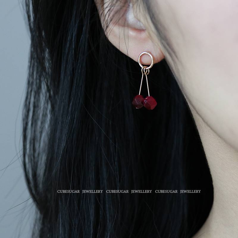 色泽美貌 镀14K金切面玫红色虎眼石樱桃耳环少女可爱百搭显白耳饰