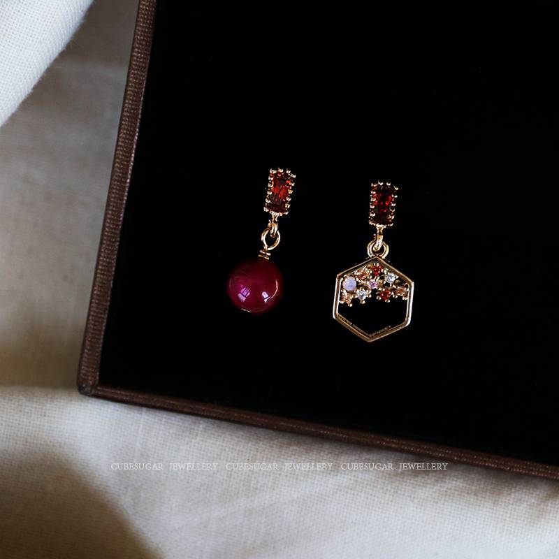 镀14K金虎眼石红色锆石不对称耳环 少女精致简约百搭耳饰
