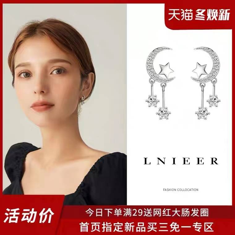 全国包邮925纯银星星月亮耳钉耳环女耳坠2021新款潮气质冷淡风防过敏耳饰