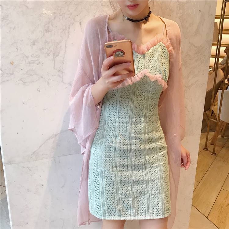 原创开衫性感豆沙绿修身蕾丝吊带连衣裙包臀短裙