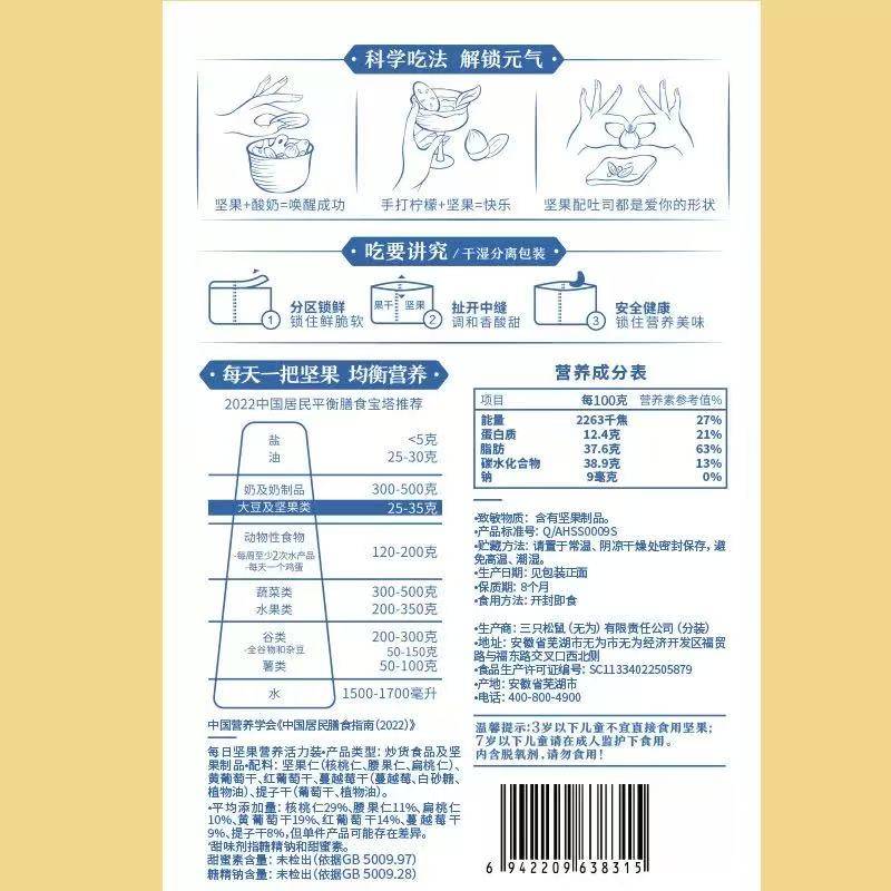三只松鼠坚果不仅美味,更是健康的宝藏。富含优质蛋白质,为您的身体补充能量,助力日常活力满满。丰富的不饱和脂肪酸,呵护心血管健康,是追求健康生活人士的理想之选。同时,坚果中所含的维生素和矿物质,如维生素 E、钙、镁等,能有效提升免疫力,促进新陈代谢。无论是忙碌的上班族,在办公间隙来上一包补充精力;还是学生党课间解馋,为学习充电;亦或是健身爱好者,用坚果补充优质脂肪和蛋白质,三只松鼠坚果都能完美适配。