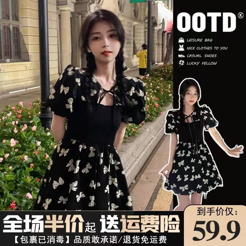 2022年新款法式初恋小众设计感短裙温柔风黑色碎花连衣裙子女装夏