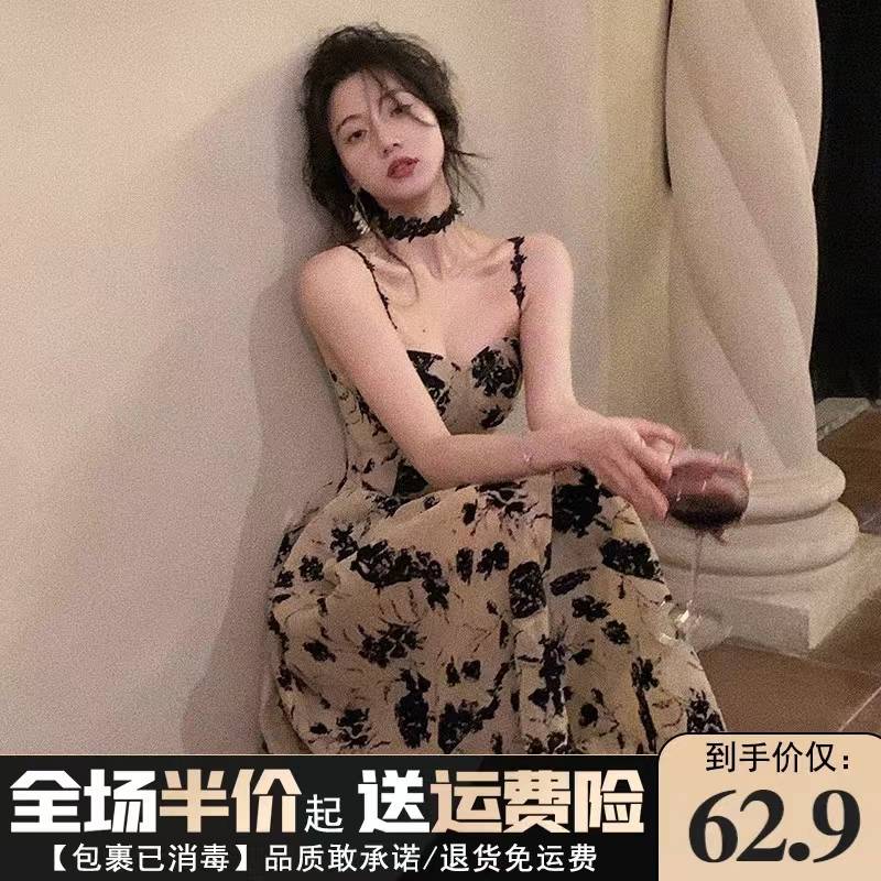 2022年新款甜辣高级感收腰长裙别致惊艳仙女碎花吊带连衣裙子夏