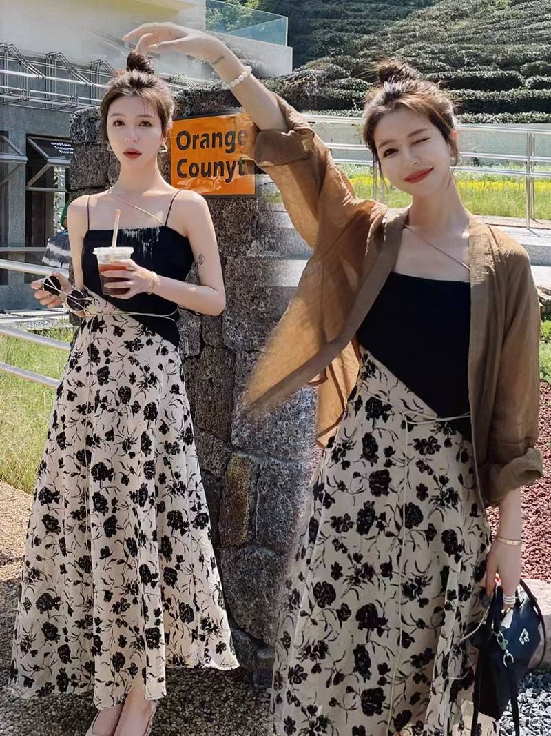 碎花吊带连衣裙女夏2022新款高级感小众设计拼接气质洋气修身长裙
