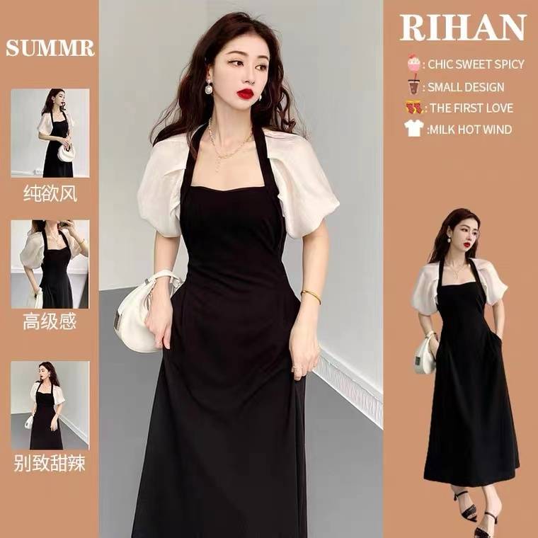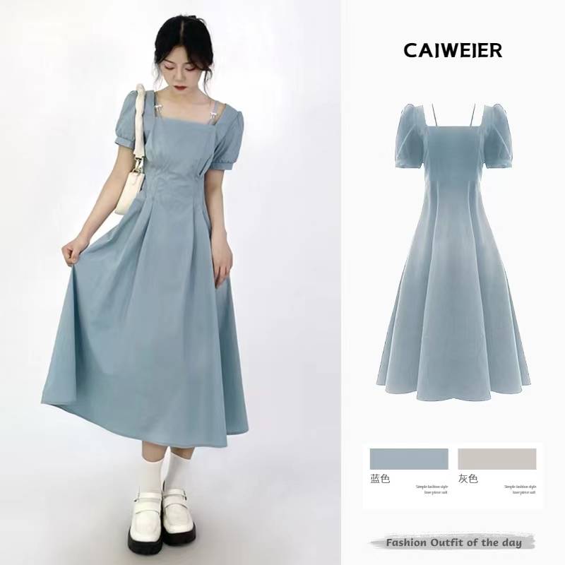 方领泡泡袖御姐名媛连衣裙女夏新款茶歇法式炸街小香风高级感长裙