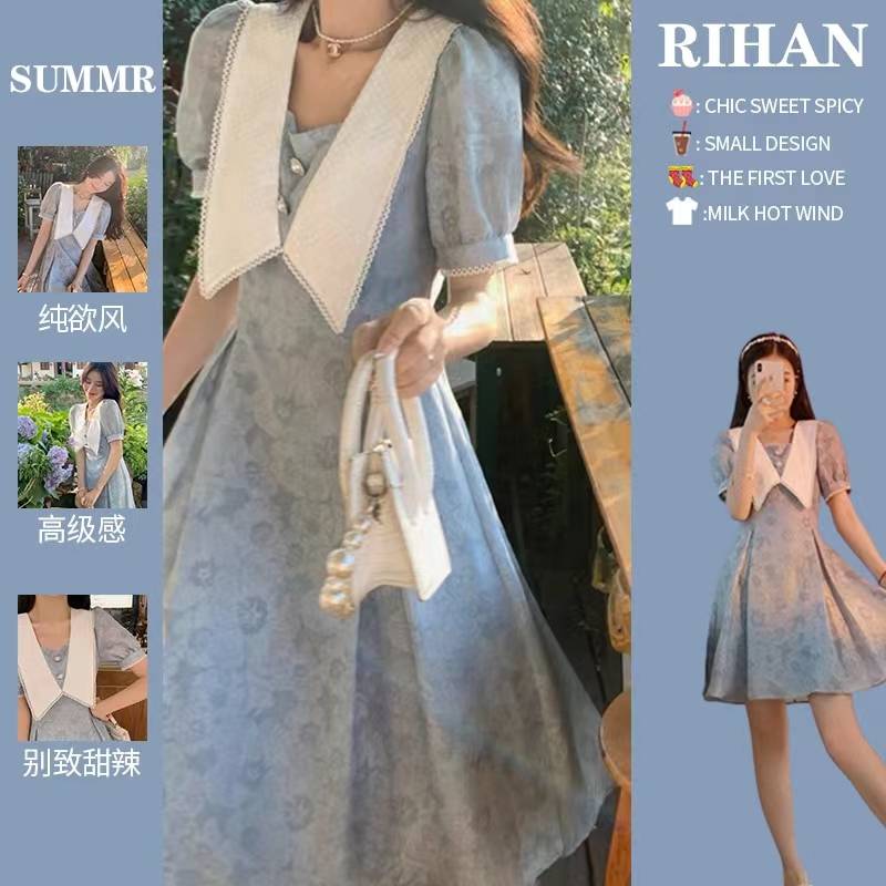 法式茶歇炸街娃娃领蓝色雪纺连衣裙夏装收腰森系桔梗奶乖惊艳长裙