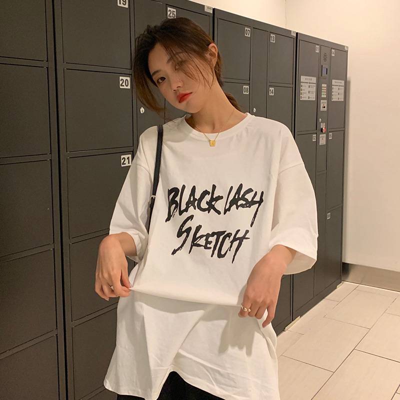 2022夏季新款韩版字母印花BF风中长款宽松大码胖MM短袖t恤女上衣