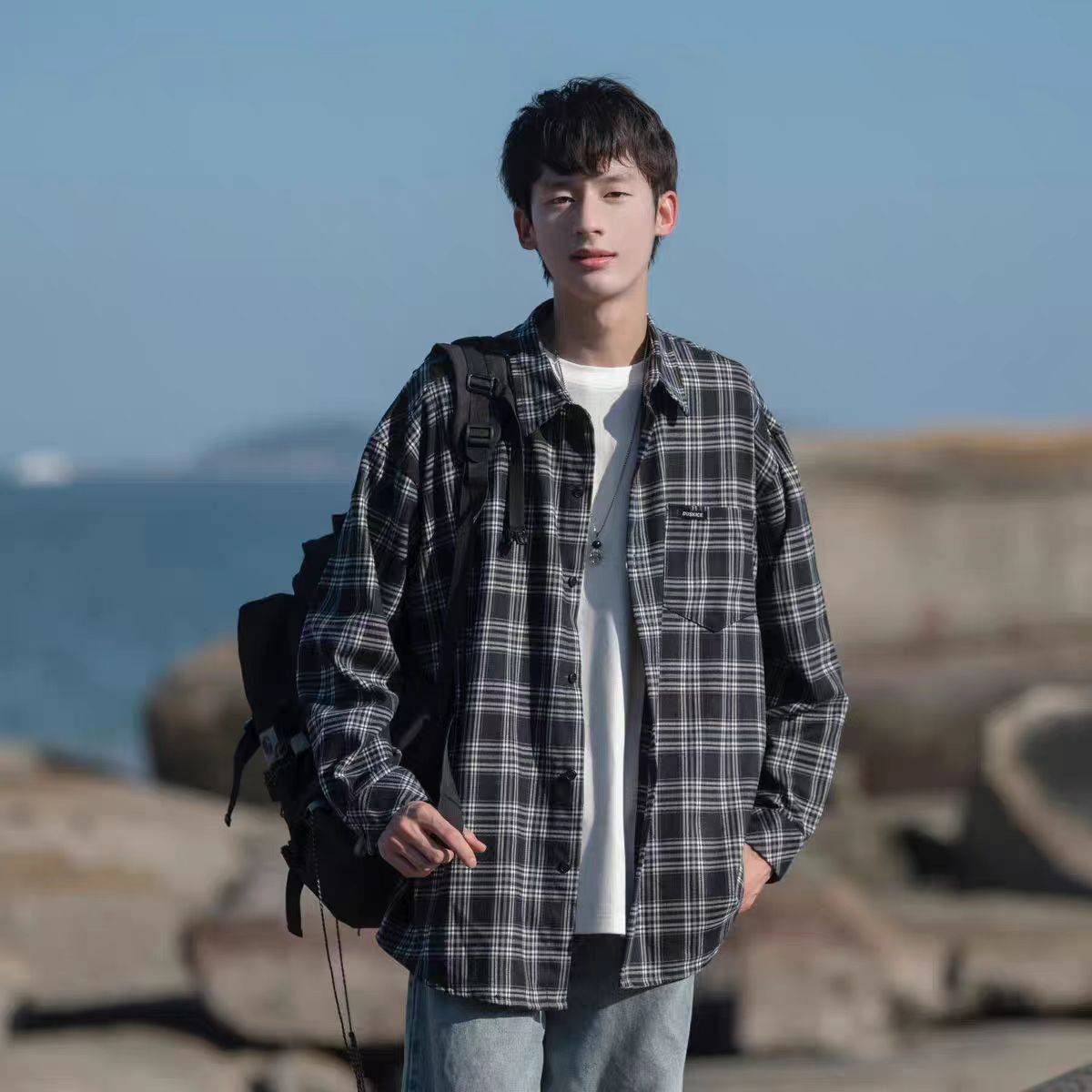 港仔文艺男日系长袖格子衬衫男春秋复古寸衫男生内搭衬衣外套男款