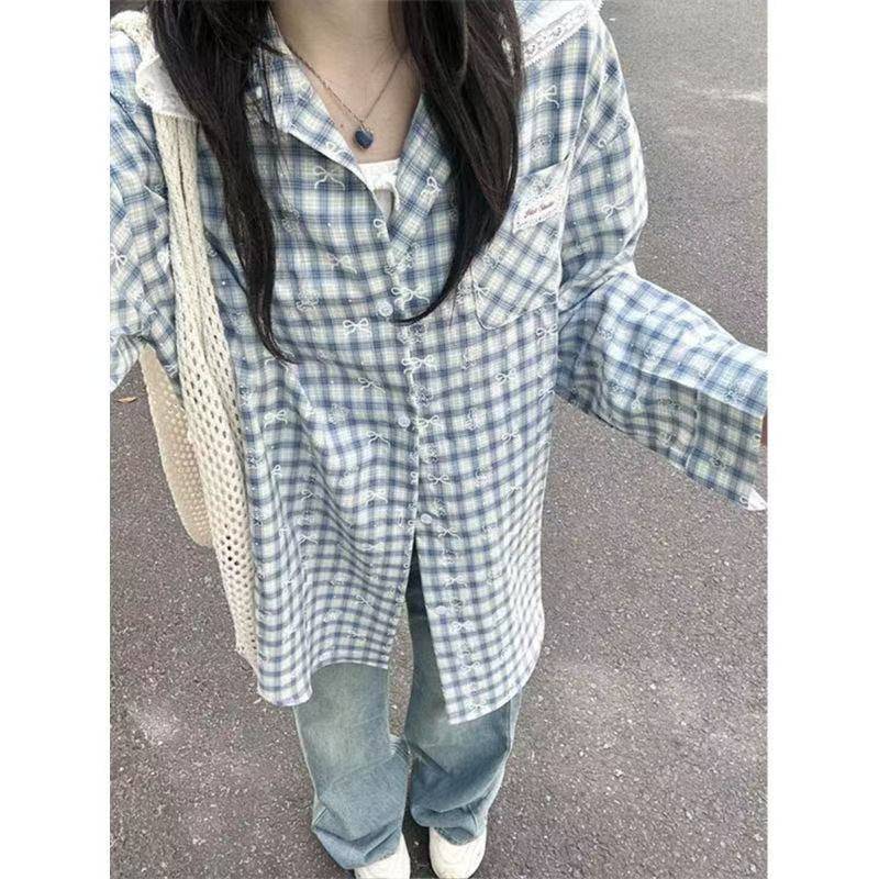 韩系甜美蕾丝花边蓝色格子衬衫女春秋蝴蝶结小熊印花长袖衬衣外套
