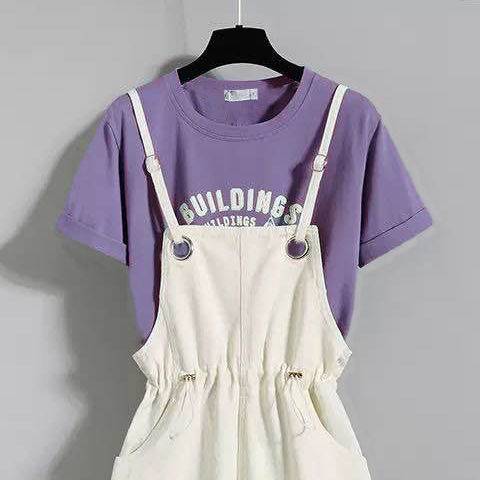 单/套装女夏背带裤女学生韩版宽松显瘦直筒阔腿连体短裤t恤两件套