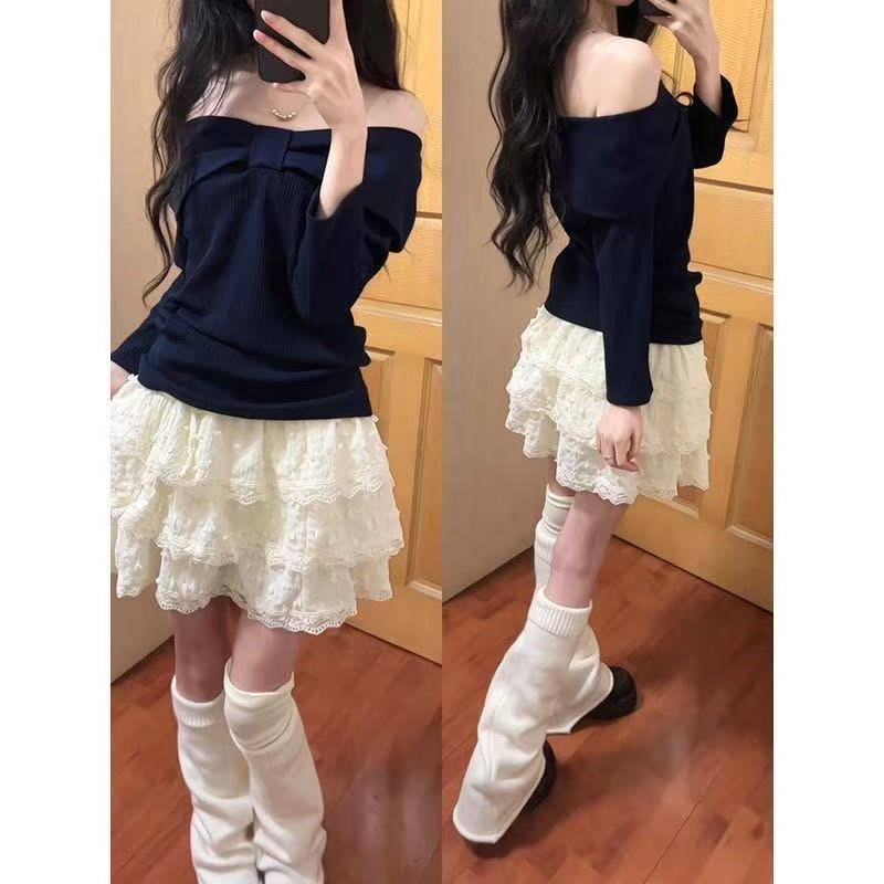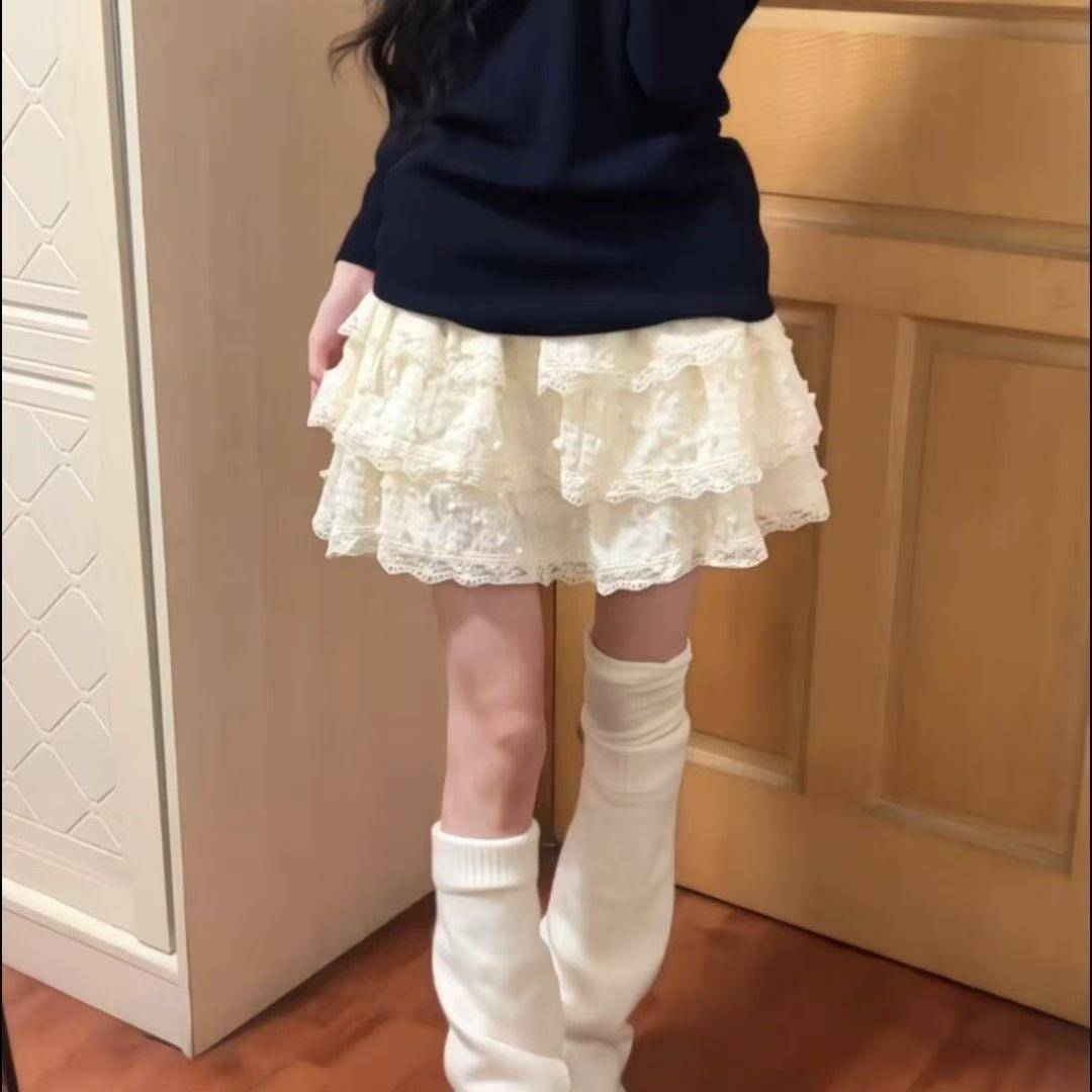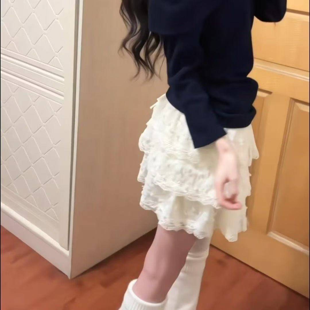 韩系小裙子女重工蕾丝花边拼接蓬蓬蛋糕裙甜美少女风穿搭半身裙子