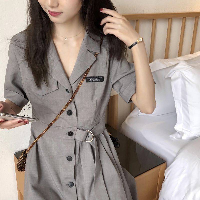 2020新款藏蓝色短袖西装连衣裙修身气质收腰显瘦学院风短裙子女夏