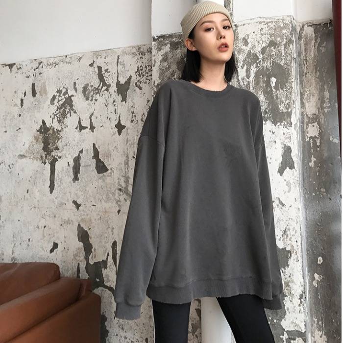 原宿纯色长袖大码上衣春中长款圆领卫衣2019新款女韩版宽松学生潮