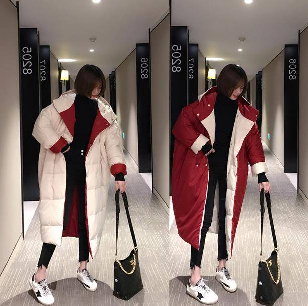 双面穿中长款加厚宽松羽绒服女2021冬新款韩版连帽过膝白鸭绒外套