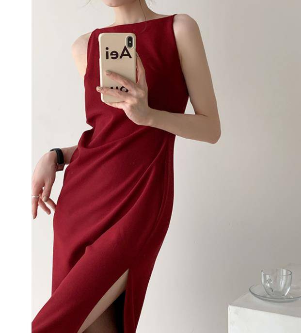 赫本风无袖连衣裙轻奢高级一字肩设计感法式气质惊艳吊带红裙女