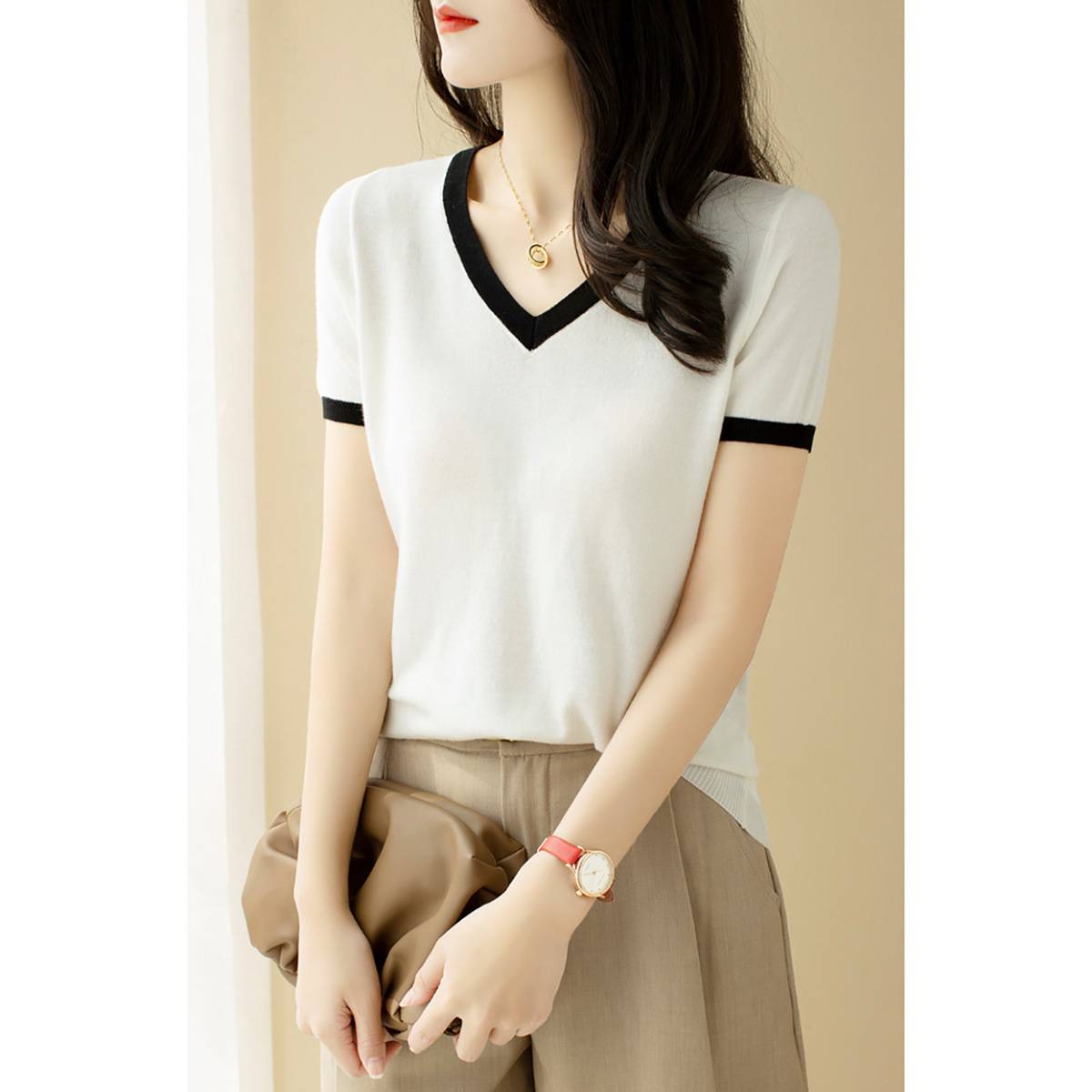 韩系薄款短袖t恤女2023夏季新款v领简约显瘦拼色冰丝针织衫上衣女