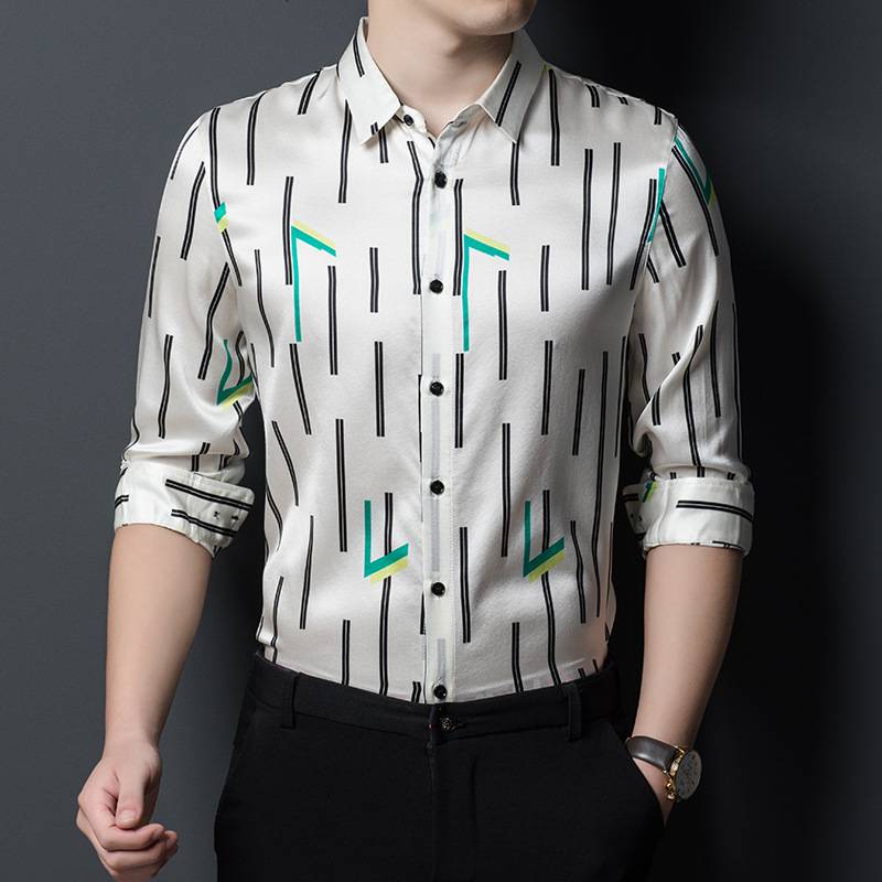 高端桑蚕丝男士长袖衬衫t恤夏新款中青年商务休闲提花免烫潮衬衣