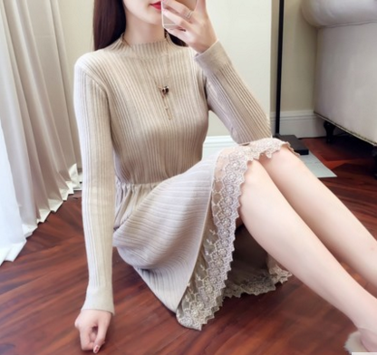 2018秋冬蕾丝打底针织连衣裙女装秋装潮韩版长款秋冬毛衣裙子过膝 128.00 已售:0件
