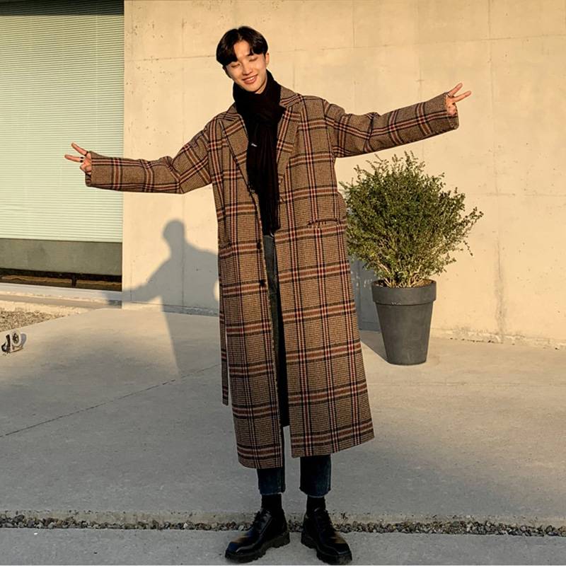 格子毛呢长款大衣潮男过膝英伦风外套2019秋冬季韩版宽松毛呢大衣