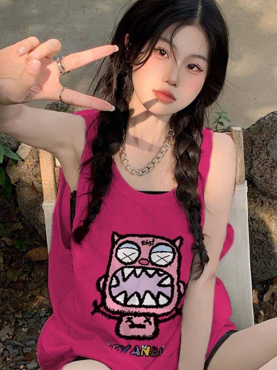【纯棉小背心】火龙果色宽松女夏穿搭坎肩无袖t恤外穿甜辣上衣潮