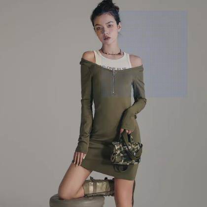 又一间女装店拼接假两件连衣裙女2023初秋新品字母印花撞色包臀裙