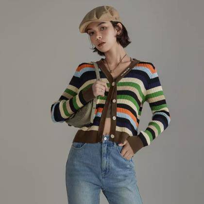 又一间女装店彩条纹针织开衫2023秋冬新品美式刺绣字母长袖外套女