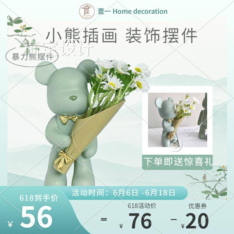 创意暴力熊捧花花瓶摆件玄关客厅电视柜插画装饰品礼物绿粉橙插画可爱