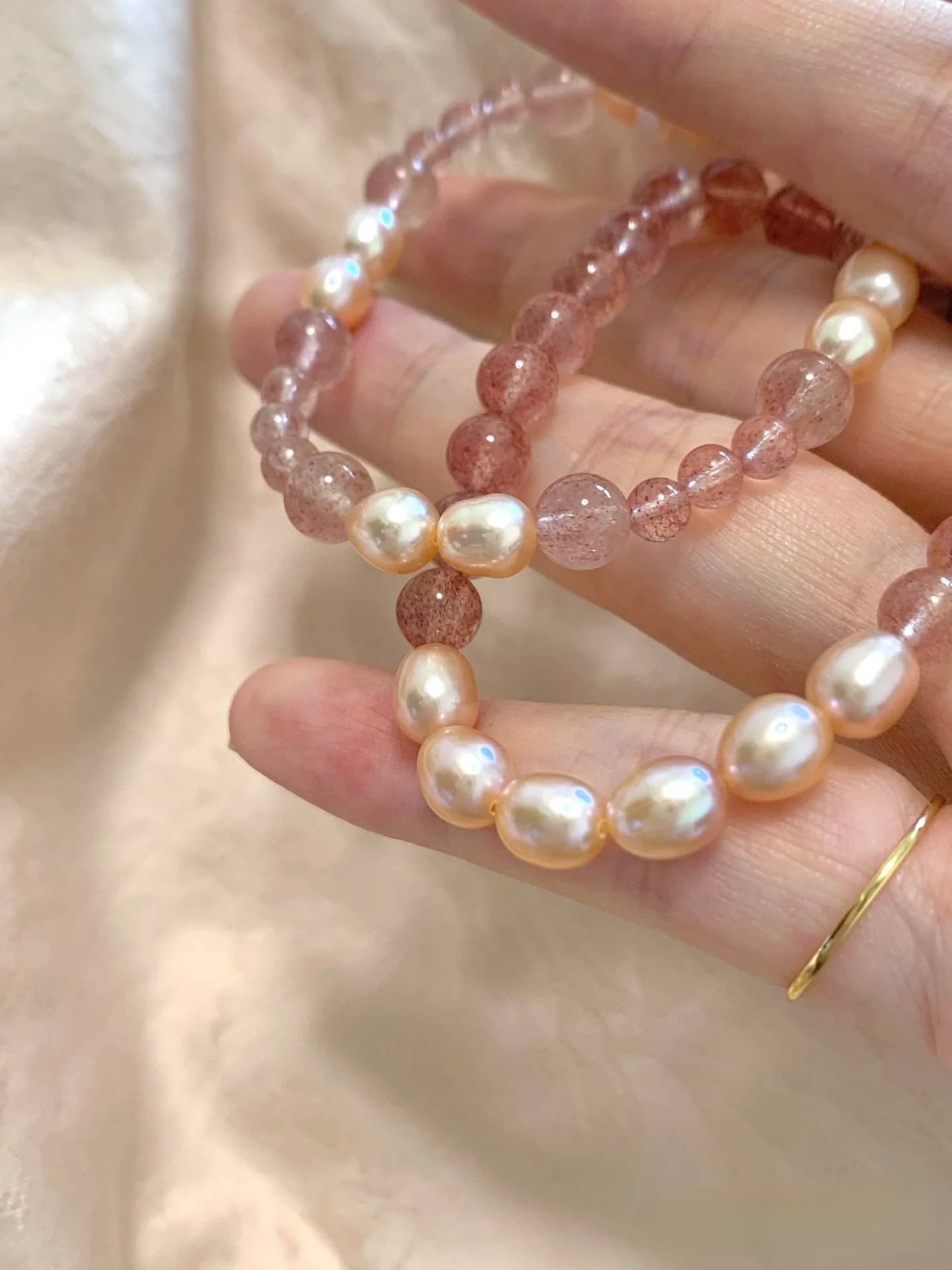 「桃花映雪」天然粉珍珠草莓晶手链轻奢精致日常甜美双层手串礼物
