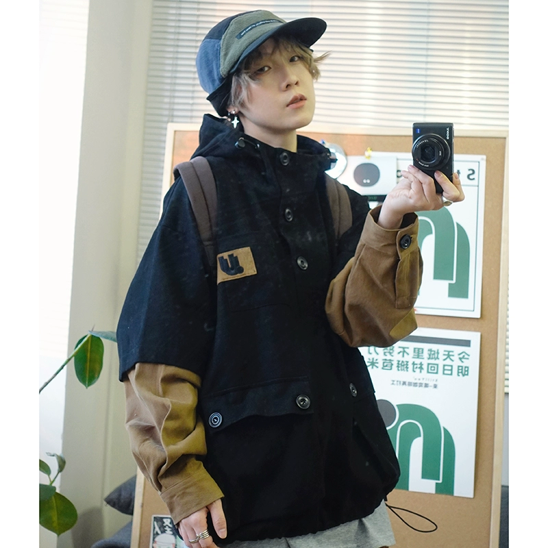 STILLYOU原创露营风拼接袖假两件工装外套连帽套头女宽松冲锋夹克