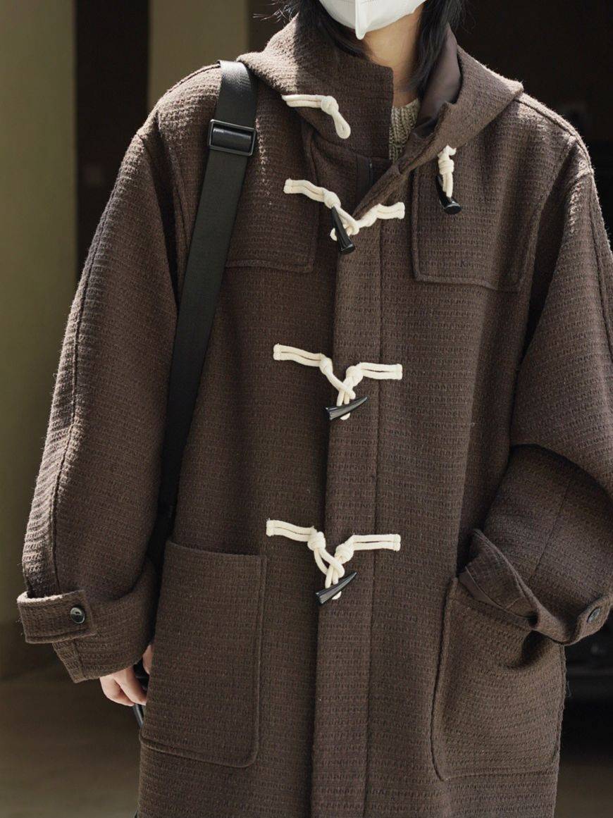 秋冬新款韩系简约复古牛角扣呢大衣宽松厚重显瘦长款休闲外套女