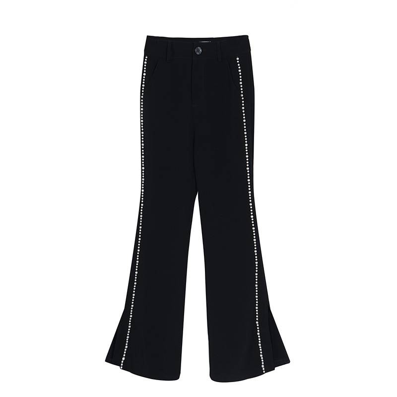 原创设计珍珠拼接喇叭裤2022新款黑色阔腿裤女简约宽松休闲拖地裤