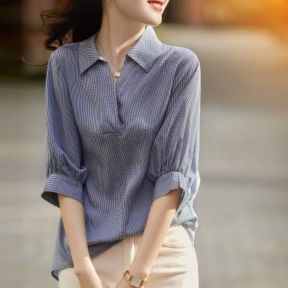 包邮格纹衬衫女设计感小众2021年新款韩版宽松复古气质五分袖衬衫 160.00 已售:0件