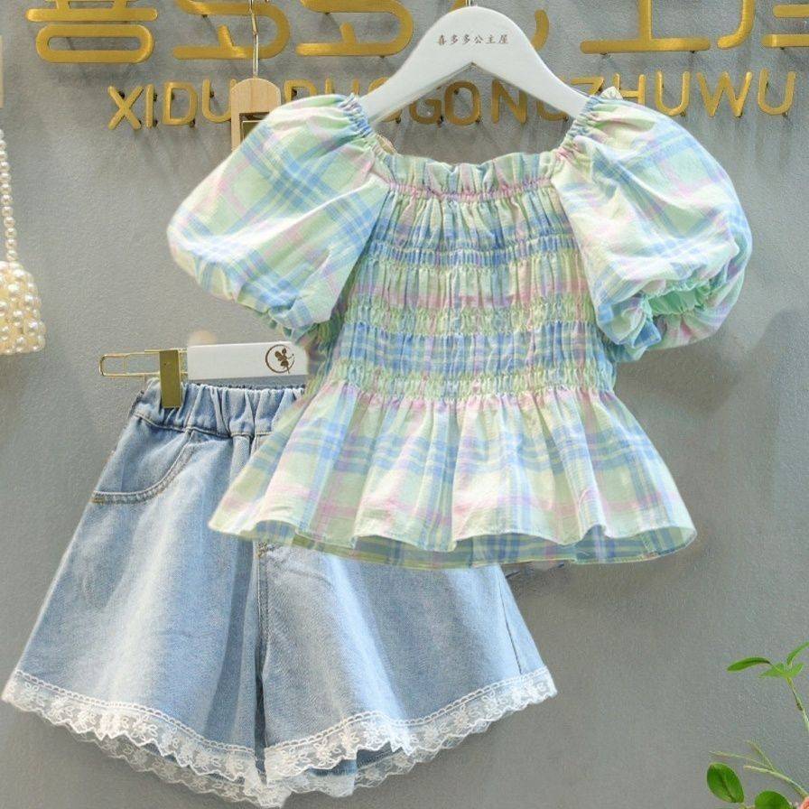女童夏季套装2024新款洋气儿童泡泡袖短袖衬衫时髦牛仔短裤两件套 50.00 已售:0件