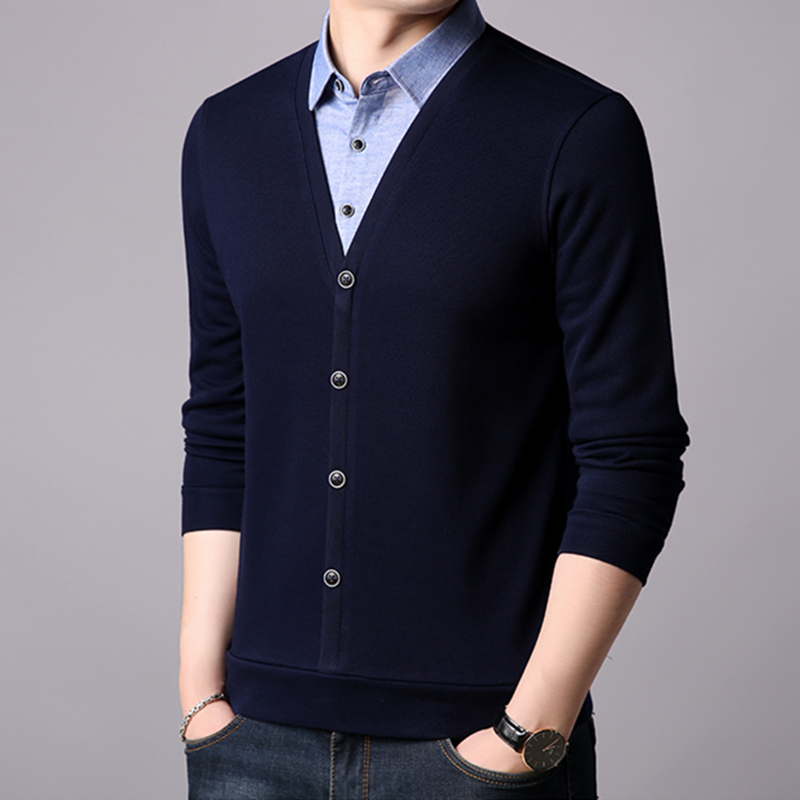假两件长袖男士T恤 秋季纯色衬衣领针织打底衫春秋装商务宽松男装