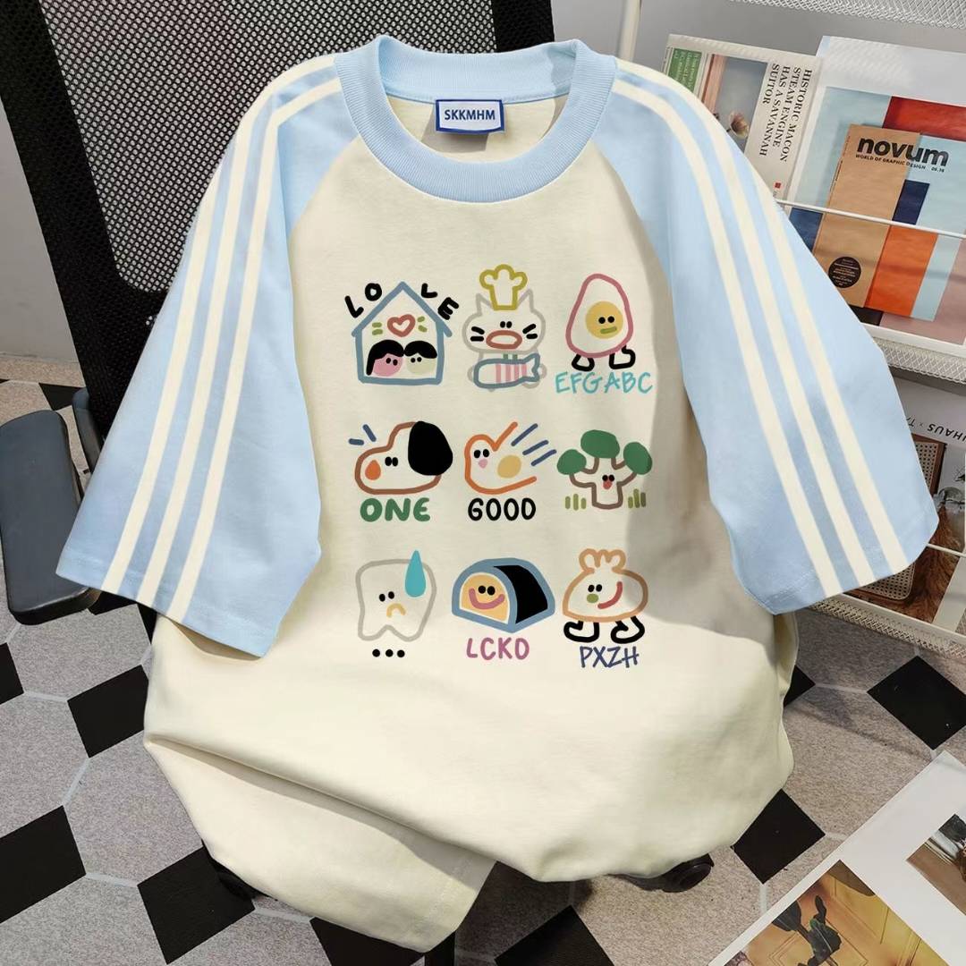 100%纯棉休闲风短袖t恤男女三条杠印花夏季宽松百搭情侣上衣ins潮