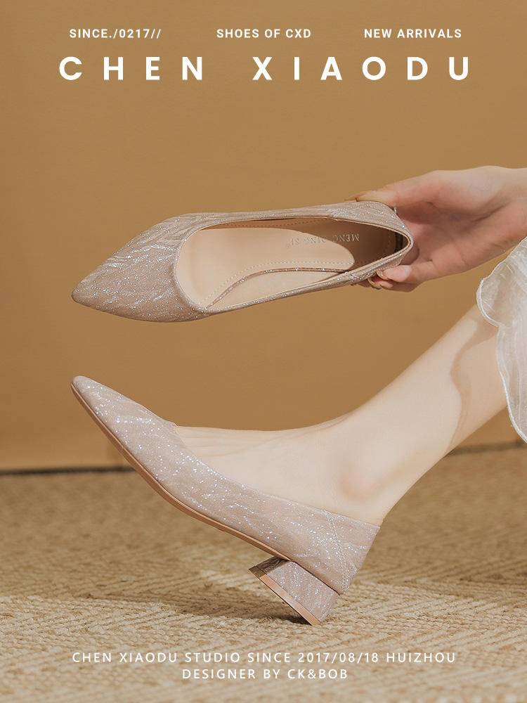2024春新款百搭尖头高跟鞋粗跟真皮软底浅口中跟鞋单鞋女 108.00 已售:0件