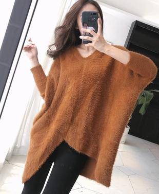 高冷范女装蝙蝠袖马海毛毛衣女秋冬新款v领加厚宽松针织衫不规则