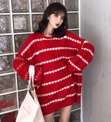 秋冬季外套韩版百搭慵懒风oversize毛衣女宽松条纹中长款毛线衣