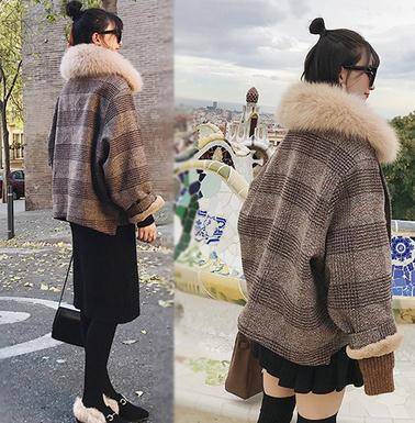 小个子韩版宽松毛呢短外套女大毛领秋冬加绒加厚千鸟格子呢子大衣