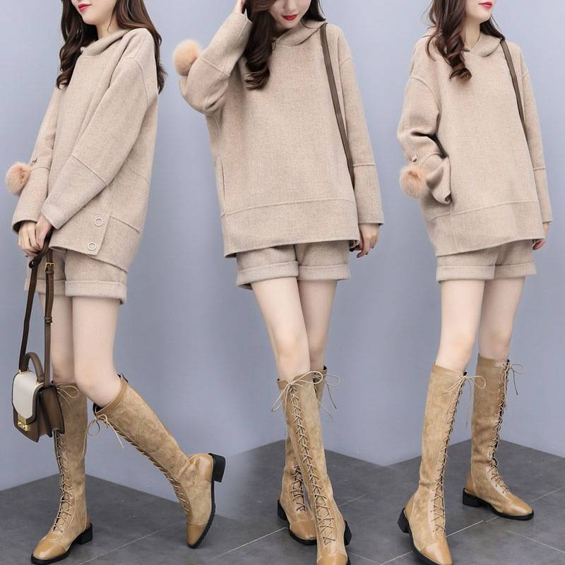 2018新款女装秋冬毛呢两件套裤连帽长袖上衣配短裤休闲时尚套装女 188.00 已售:0件