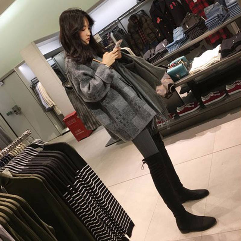 韩国女装2018秋冬新款加厚宽松格子羊毛毛衣复古百搭针织开衫外套