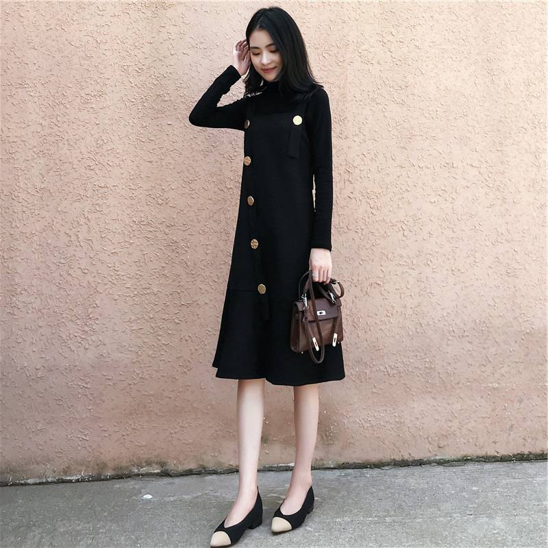 2018秋冬新款女装韩版两件套装裙背带裙中长款打底裙黑色连衣裙