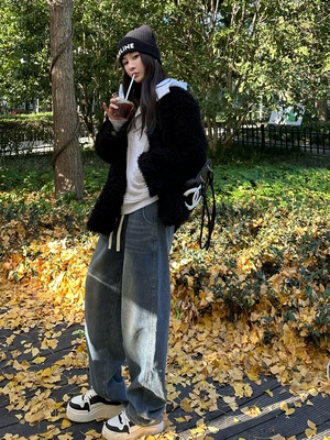 好看耐穿复古加绒阔腿牛仔裤女冬季新款宽松显瘦直筒裤