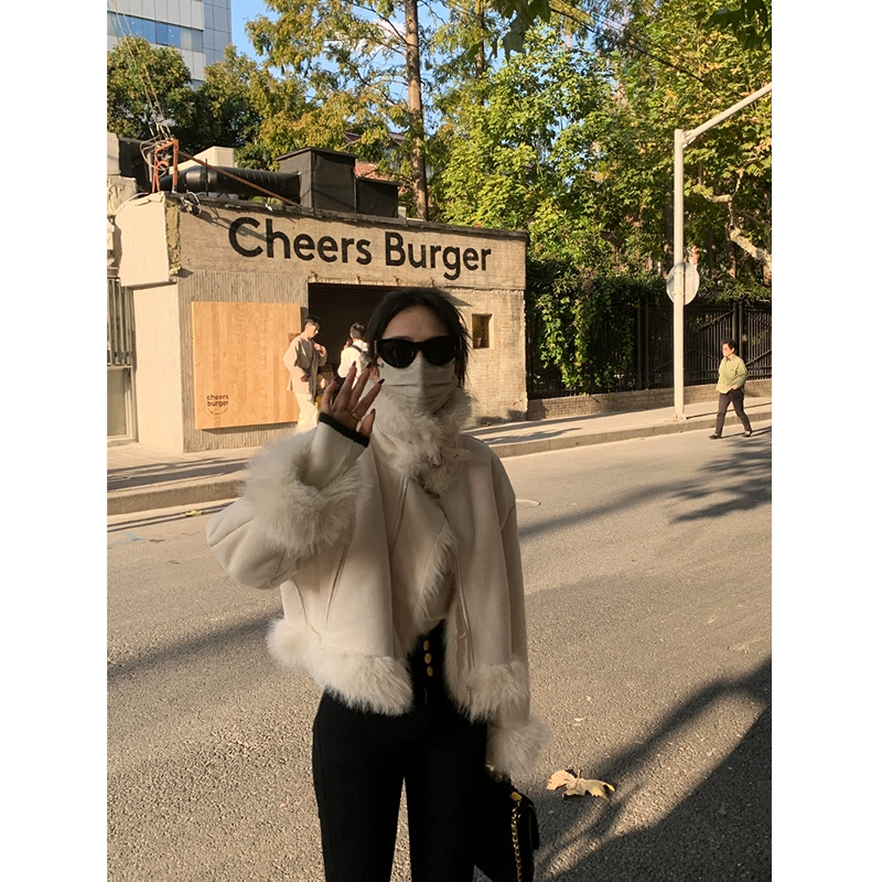 皮毛一体毛毛外套女冬季环保皮草派克服短款机车服