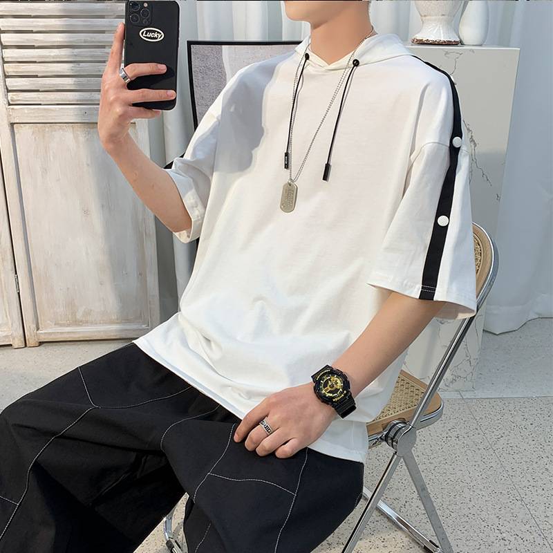 2021新款夏季短袖男生帅气拼色透气小众潮流休闲连帽英文短袖包邮