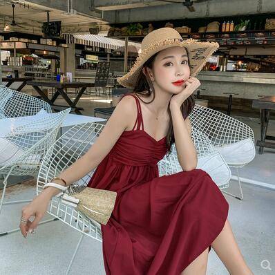 2019夏季新款小性感纯色收腰大摆吊带连衣裙