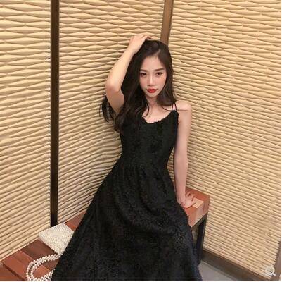 夏装新款韩版显瘦V领连衣裙女中长款气质小黑裙露背吊带裙